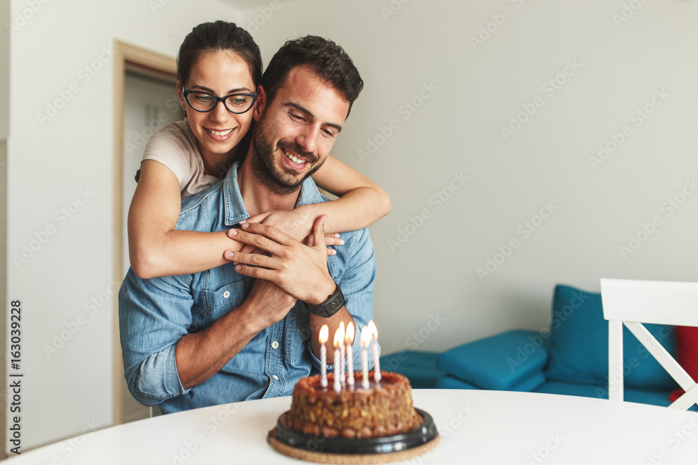 Husband S Birthday Wife Surprise His Husband With Birthday Cake Anniversary Stock Photo Adobe Stock